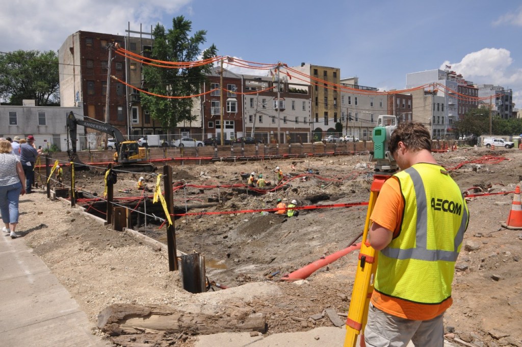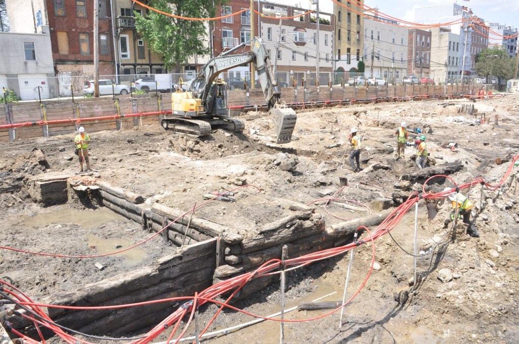 The site was first tested in 1987 by Carmen Weber, Philadelphia City Archaeologist back when the city had such a position. Her work exposed the wooden slip or ships way pictured above.